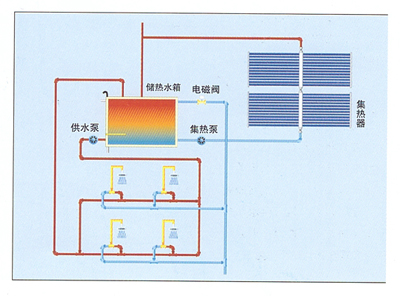 本系統中集熱器集中放置,設置滿足用戶需求容量的大型儲熱水箱,控制系統、循環(huán)裝置及其他輔助設...